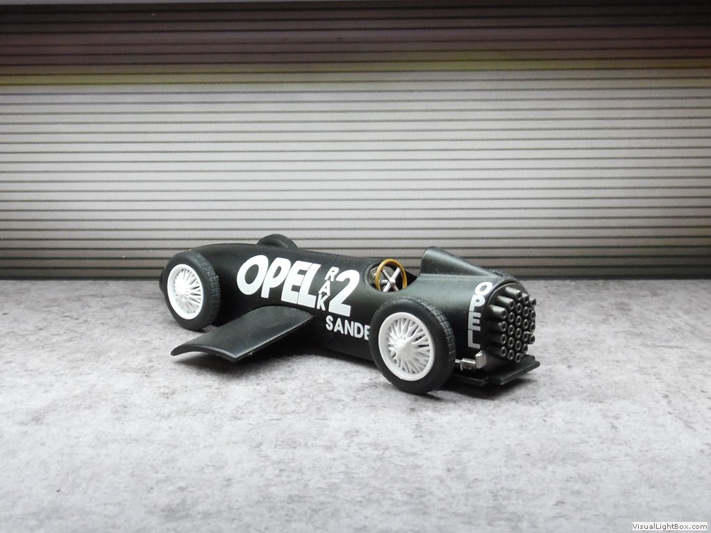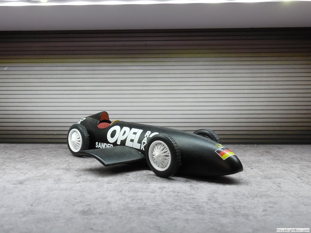Presentationsmodell in weiss mit typischen Opel-Rennfarben, wie beim Kadett E Rallye
